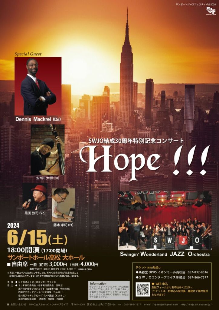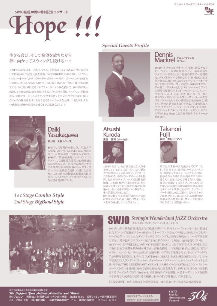 こちらは高松のビッグバンドSWJO (Swingin’ Wonderland Jazz Orchestra) の30周年記念コンサートです。お声がけをいただいて、私も少しだけベースで参加させていただきます。